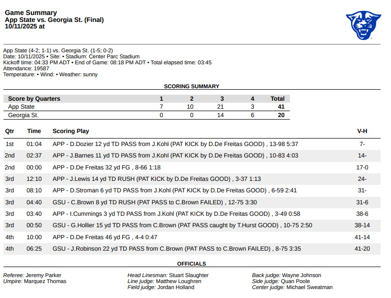 By David Rogers. ATLANTA, Ga. — Two methodical offensive drives in the first half directed by App State quarterback J.J. Kohl along with a shutdown defensive performance set the tone against Georgia State on Oct. 11. The Mountaineers cruised to a convincing, 41-20 win.