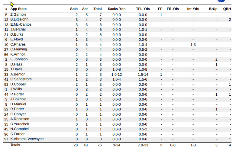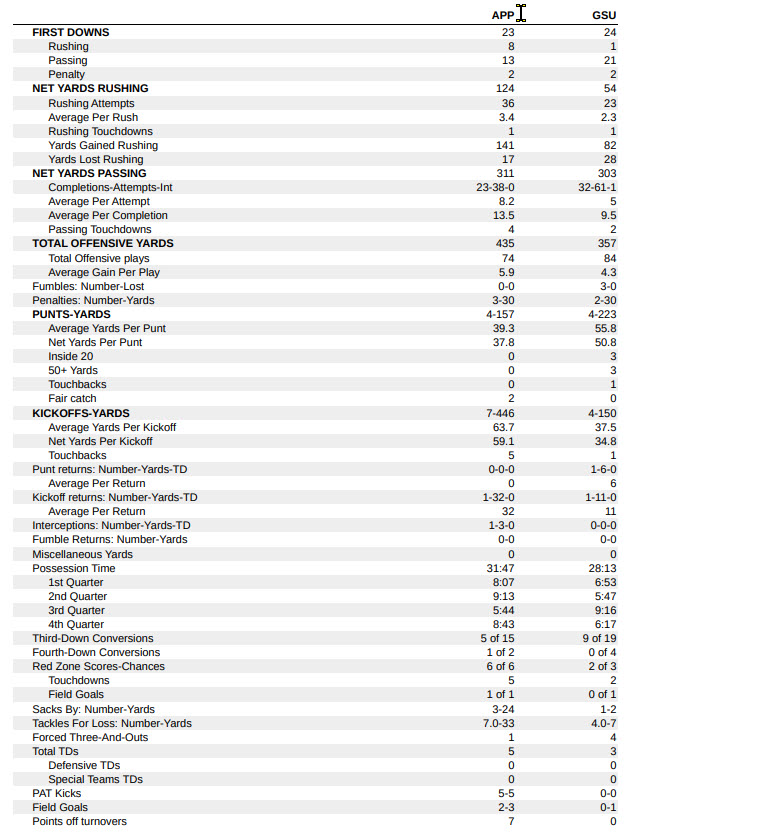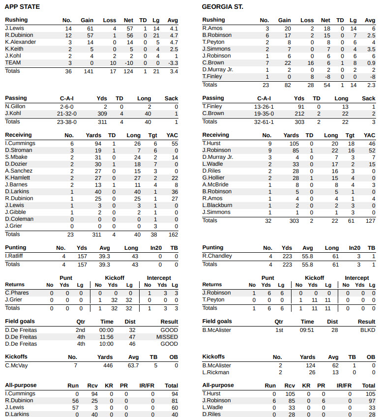 Defensively, App State held the Panthers scoreless until late in the third quarter. It was 31-0 before the Mountaineers’ hosts saw the end zone at the 4:40 mark of Q3 when quarterback Cameran Brown found tight end Grant Hollier for a 15-yard TD. Even though Georgia State manufactured a trio of TD-scoring drives in the third and fourth frames, the Mountaineers always countered with points of their own, never allowing the Panthers to seriously threaten.