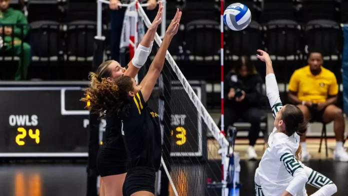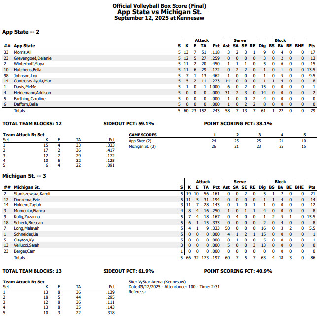 By Katherine Jamtgaard. KENNESAW, Ga. — The App State volleyball team suffered its first setback of the 2025 campaign after falling short to Michigan State in five sets (24-26, 25-21, 25-23, 21-25,10-15), at the Kennesaw State Invitational on Friday. The Mountaineers will enter Saturday’s noon match against Kennesaw State (4-2) with a 6-1 record. Saturday’s match will be available to stream on ESPN+.