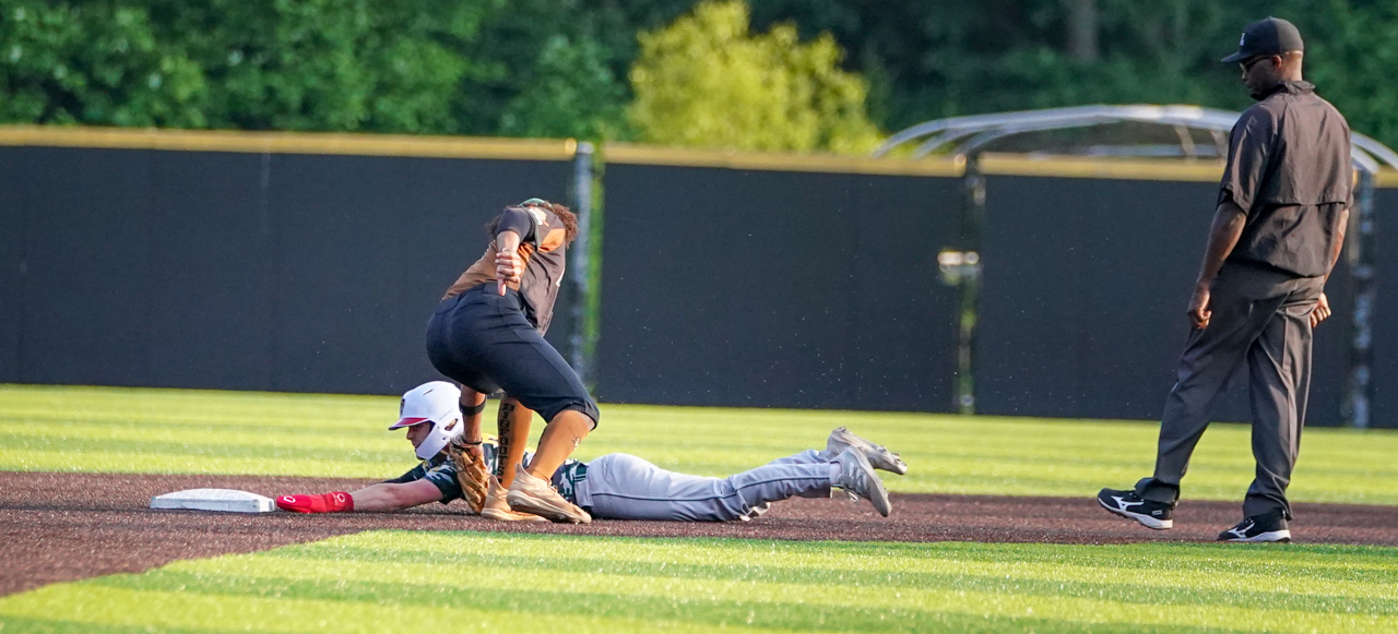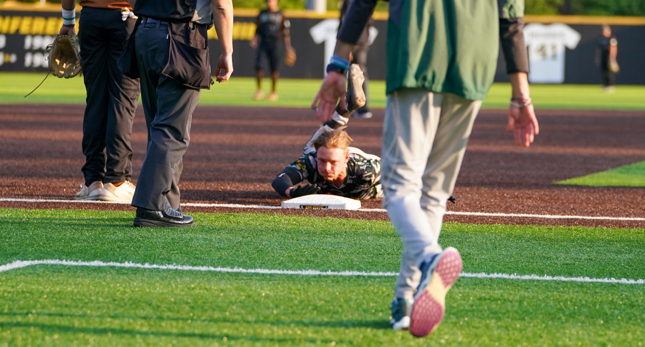 Two of the Owls’ nine doubles happened in the first inning, beginning with shortstop Matthew Heavner’s leadoff rip to the gap in left field. He plated the game’s first run of the evening just one batter later when Owl right fielder G. Allen singled, the speedy Heavner not pausing as he rounded third (see cover photo) and headed home, standing up. Allen later scored on third baseman Brady Jeffcoat’s double to left, accounting for the Owls’ second earned run of the opening frame.