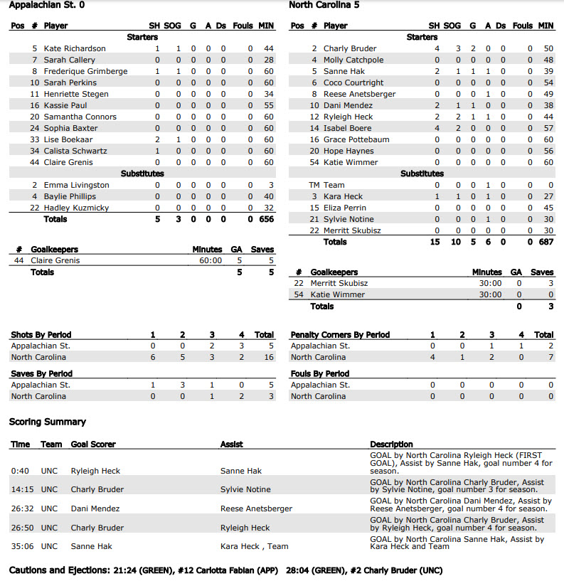 3rd Quarter: North Carolina scored its fifth goal of the game with 9:50 remaining in the period. The Mountaineers kept up the pressure, earning their first penalty corner of the game, but the Tar Heels maintained their 5-0 lead.