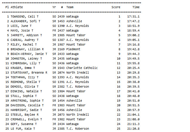 While Townsend conquered the demanding course in 17:31.1, a little more than 16 seconds ahead of No. 2 Sofi Alexander, a senior from Asheville HS (17:47.2), her Pioneer teammates also had strong finishes, the seven harriers representing Watauga all finishing in the top 25.