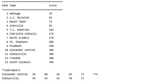 Watauga’s 35 team points was far ahead of second place A.C. Reynolds (66 points) and third place Mount Tabor (72).
